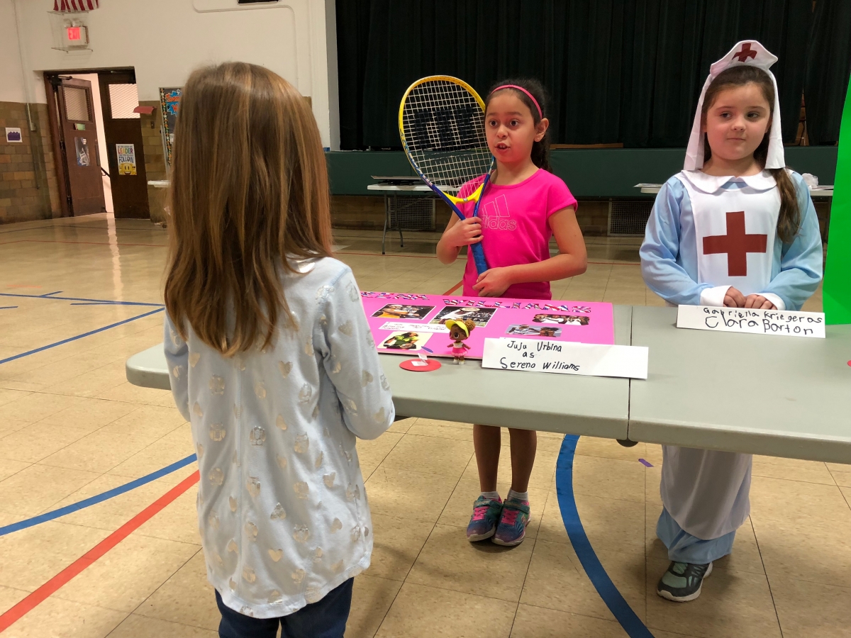 Second grade students selected a historical figure to study and then prepared a presentation about his or her life and wrote and memorized a quick biographical speech. On the day of the Wax Museum, students dressed as their famous American. As other students and guests walked through the "museum," visitors could hear the biographical speech if they pressed a "button" at each figure's table.