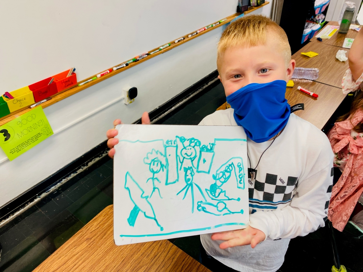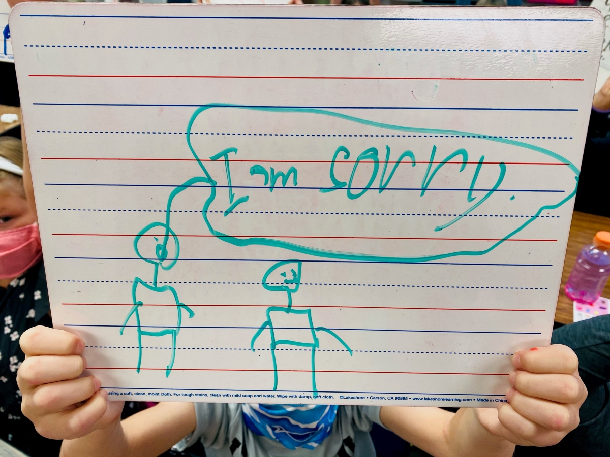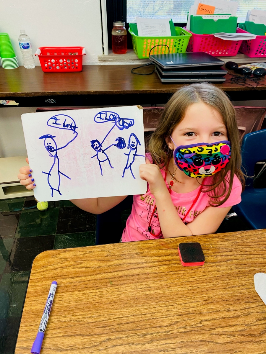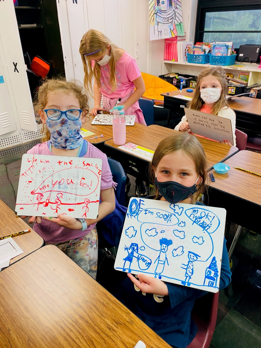 Using the Upstairs and Downstairs Brain model, Mrs. Snelling explains how emotions affect our brain and how we can use the strategy of deep breathing to self-regulate.  The Upstairs Brain is our thinking brain.  When we are in our Upstairs Brain, our bodies have positive emotions and feel good (regulated), we have empathy for others, can be kind and play respectfully, can control our bodies, and make responsible decisions.  When we are in our Downstairs Brain, our bodies don’t feel good (dysregulated), our emotions have become too strong and we flip our lids (flight, fight, freeze).  The goal is to recognize when our bodies start to not feel good (start to become dysregulated).  This is when you can feel yourself start to go down your stairs.  When your body starts to become dysregulated and not feel good anymore, take deep breaths and walk back up your stairs.