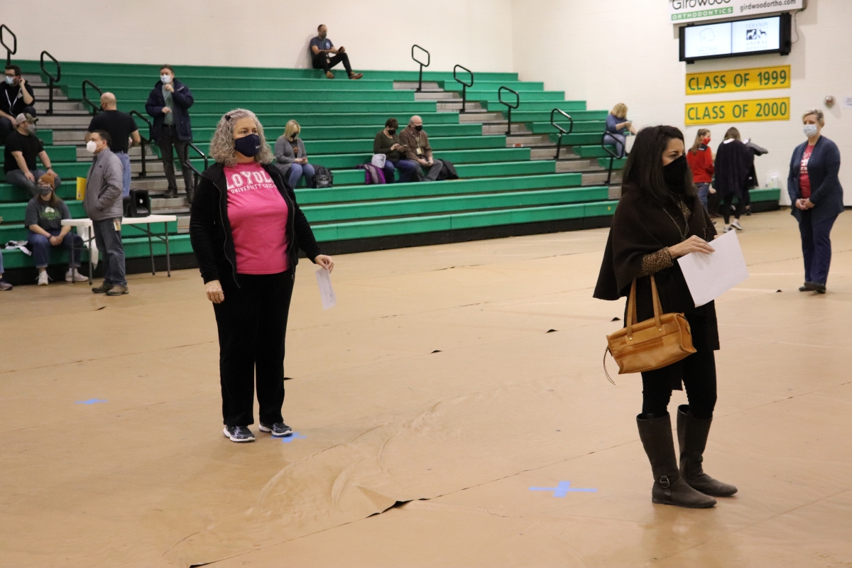 On Friday, February 19th, 2021, Little Miami staff and teachers who opted to receive the COVID-19 vaccine were inoculated with the first dosage of the Pfizer vaccine. In a planning effort that spanned months, this vaccination went smoothly & efficiently, with very few staff members waiting in line at any given time. Little Miami proudly partnered with Mercy Health/Jewish Hospital, who sent three vaccinators to Little Miami High School to help administer vaccines to approximately 62% of LM staff members in just under four hours. After arriving for their scheduled time allotment, staff members were quickly vaccinated and then ushered to the gymnasium bleachers, where they could be observed for potential adverse effects in a socially distant manner. In total, vaccinated teachers/staff members were able to be in and out of the vaccine administration area within 20 minutes!